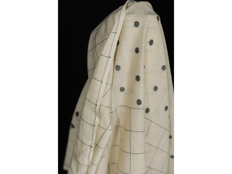 Wunderschöner zarter Jamdani Cotton mit eingewebten schwarzen Punkten und Karos. Jamdani Stoffe sind zarte Musselin Gewebe, die in Indien seit Jahrhunderten in traditionellen Manufakturen hergestellt werden. Die Kunst der Jamdani Weberei hat daher mittlerweile sogar den Status eines Unesco Weltkulturerbes zugesprochen bekommen. Typisch für diese Stoffe sind die farblich eingewebten Muster, in diesem Fall die schwarzen Dots und Linien, bzw. Karos. Diese sind nicht aufgedruckt, sondern wirklich eingewebt. Dadurch bekommt der Stoff einen lebendigen Charakter und sehr schönen Charme.