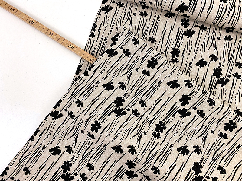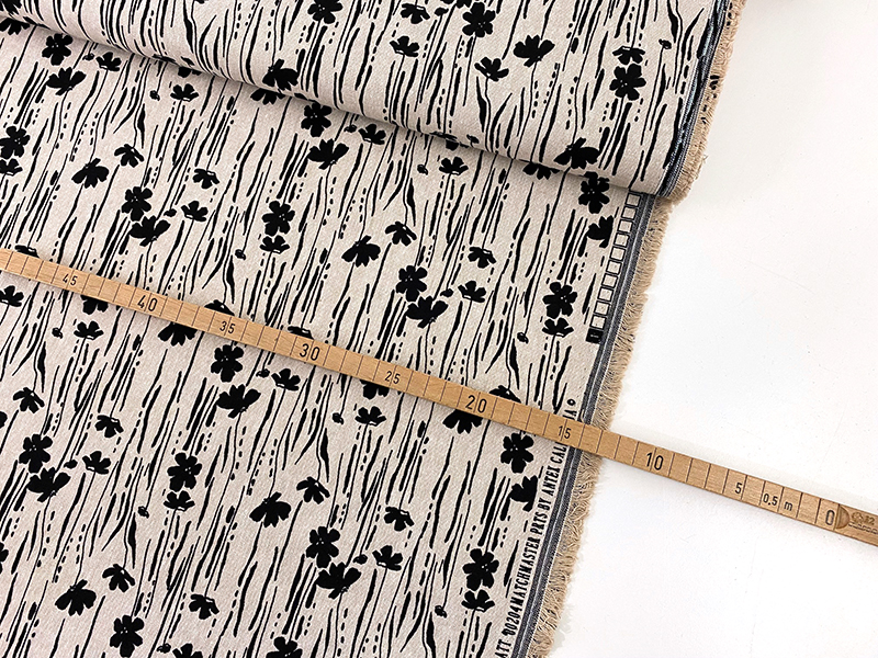 Wunderschöne Halbleinenqualität von Robert Kaufman mit einem floralen Design von Anna Graham, besser bekannt als Noodlehead :-). Der Stoff ist ecru mit Gräsern und Blüten in schwarz. Die Halme und Blüten wirken wie aufgestempelt.
