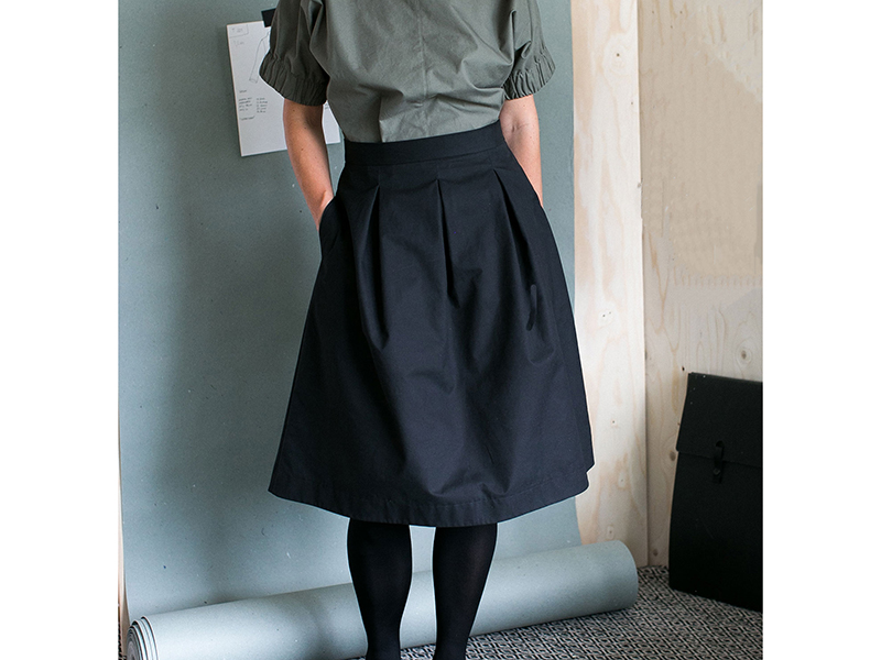 Ein Rock mit 3 Kellerfalten vorn, hinten ist der Schnitt schlicht. Rechts gibt es eine unsichtbare Seitentasche, links einen Reißverschluss.