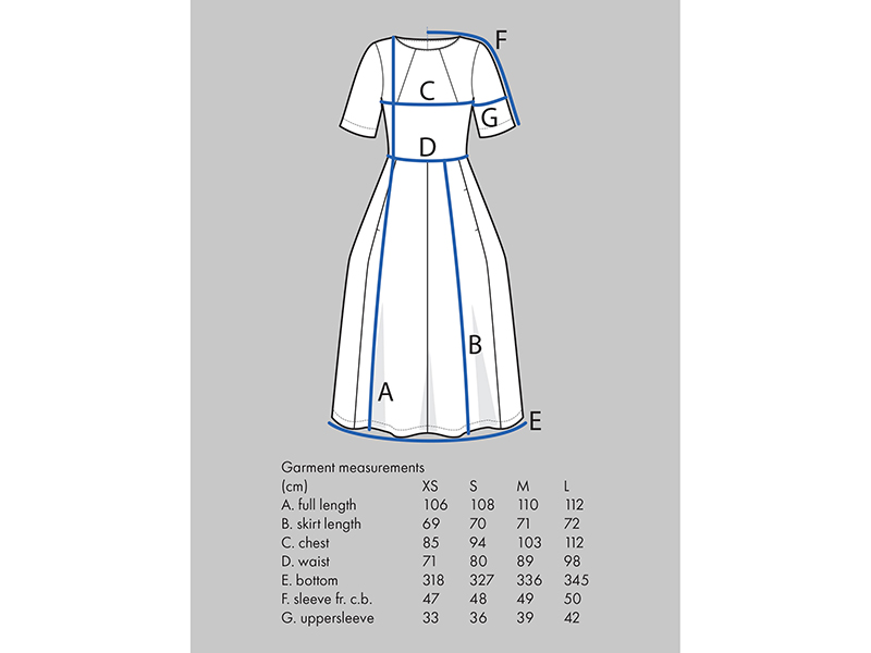 Der Stoffverbrauch bei einer Stoffbreite von 140cm: XS = 2,7 m, S = 2,8 m, M = 2,9 m, L = 3,0 m