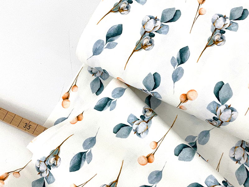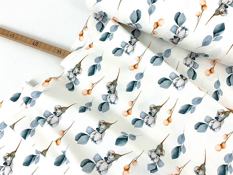 Sehr schönes Design mit Baumwollblüten und Beeren in silbrigem Petroblau und zartem Rostrot auf hellem Grund.