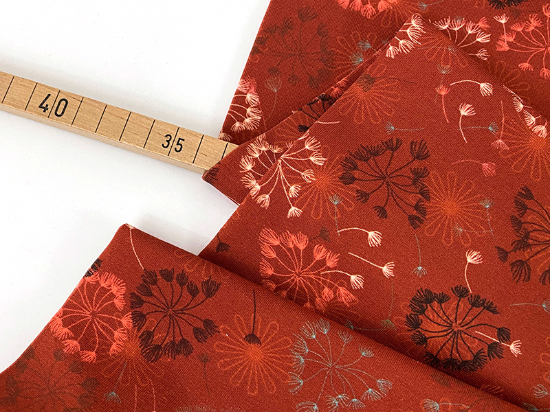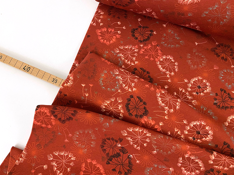 Zarte Pusteblumen in Koralle, dunklem Braun, hellem Mint und Natur auf schönem Rostrot.