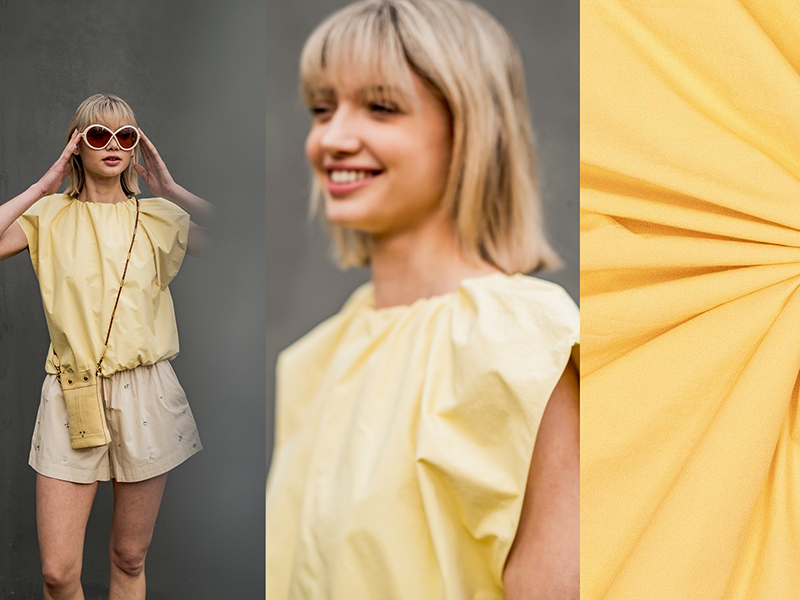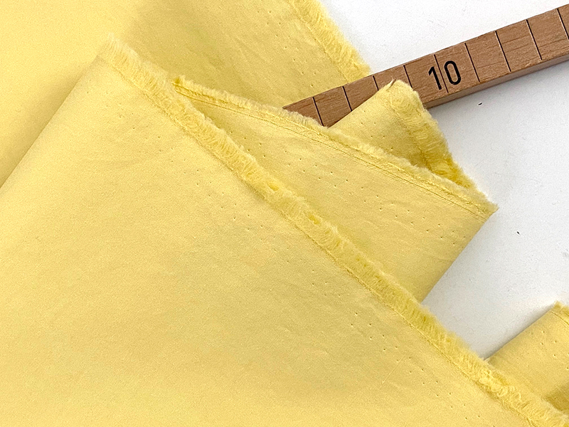 Gewaschene Baumwolle mit einer sehr schönen stone washed Oberfläche, d. h. einem matten und edlen Finish und etwas Crisp. Dadurch besitzt der Stoff etwas Lässiges und gleichzeitig Wertiges und ist weit mehr als eine einfarbige Baumwolle. Er ist leicht, trotzdem nicht durchsichtig und besitzt etwas Stand. Der Farbton ist ein zartes Vanillegelb (gedecktes Zitronenfaltergelb).