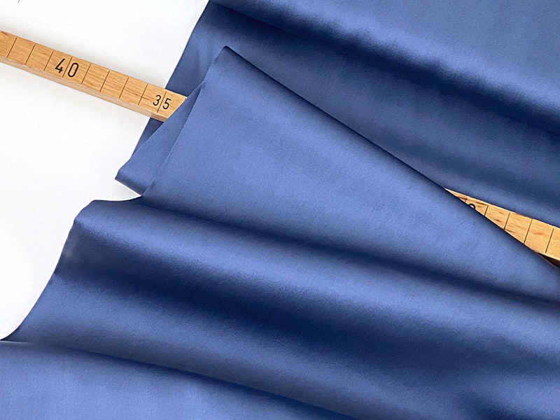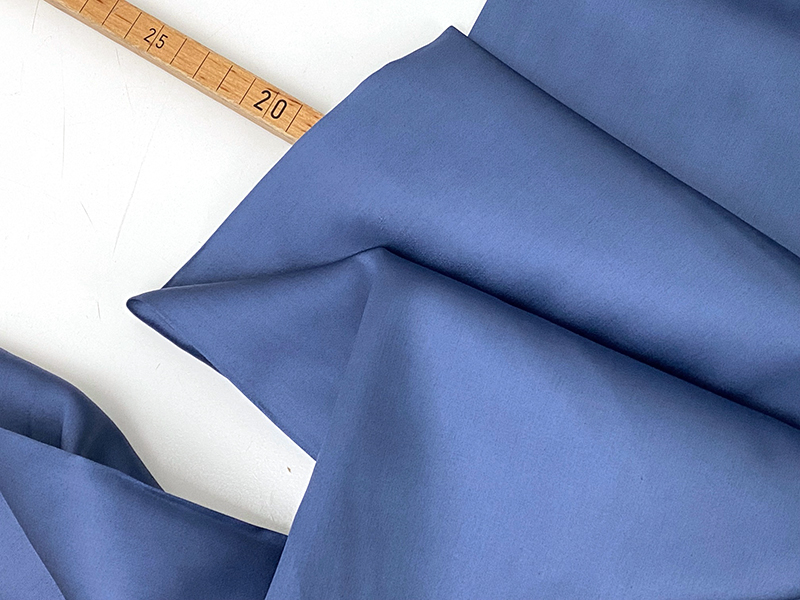 Satinierte Baumwolle mit einer glatten Oberfläche und einem dezenten Schimmer. Dadurch besitzt der Stoff einerseits etwas Lässiges und gleichzeitig auch Wertiges und ist weit mehr als “nur” eine einfarbige Baumwolle. Er hat einen schönen Fall und trotzdem etwas Stand. Der Farbton ist ein schönes, nicht zu helles Jeansblau.