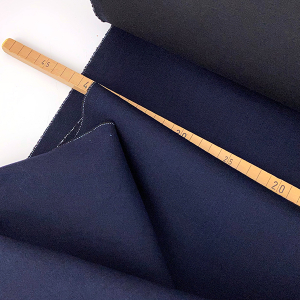 Klassischer mittelschwerer bis schwerer Denim in dunklem Indigoblau mit einer schön derben, aber gleichmäßigen Webung. Das Material ist gewaschen (dennoch gleichmäßig dunkel) und besitzt dadurch nicht mehr diesen ganz steifen Griff, sondern ist bereits etwas weicher und trotzdem eher robust.