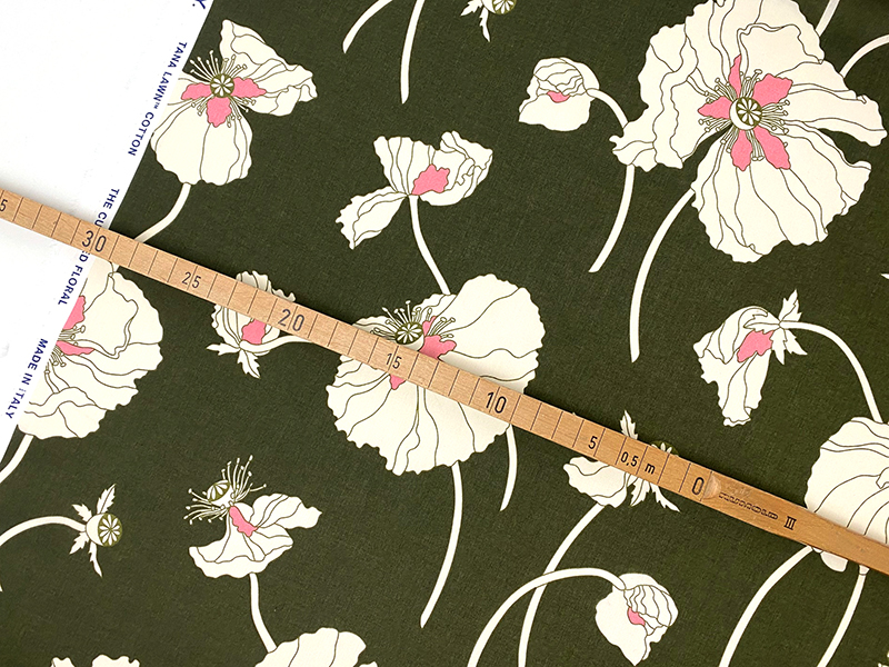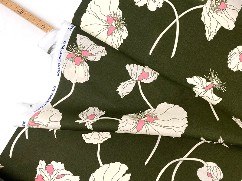 Zarter Baumwollbatist in einzigartiger Qualität mit einem markanten Muster großer Mohnblüten in Offweiß mit rosafarbenen Akzenten auf sehr geschmackvollem Oliv. Ein auffälliges und gleichzeitig großartiges Design!