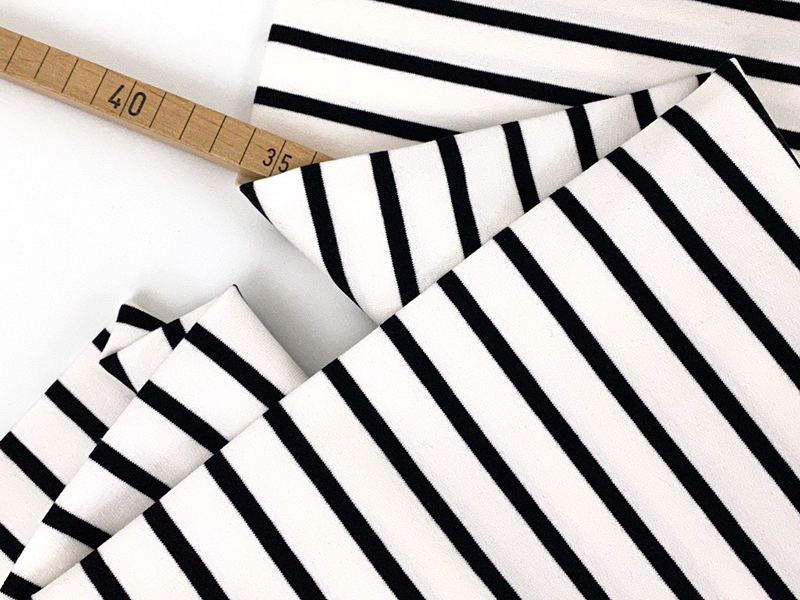 Baumwoll French Terry mit schicken Streifen in Weiß (Off-White) und Schwarz. Klassisch und immer wieder gut. Die Rückseite ist geschlauft.