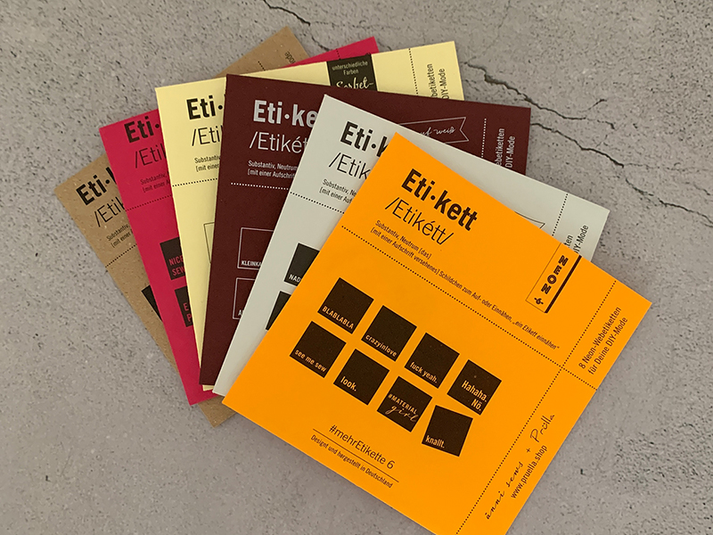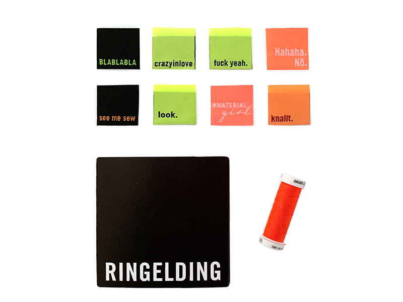 Die Etiketten sind mit einem zur Nähszene passenden Begriff oder Spruch versehen. Dieses Mal gibt es 5 unterschiedliche Grundfarben (3x Neongelb, 2x schwarz, 1x Neonorange, 1x Neonkoralle, 1x Neonpink) mit entweder schwarzer, weißer oder Neonschrift. Sie sind 3 x 3 cm groß, mit Mittelfalz – perfekt zum Ein- und Aufnähen.