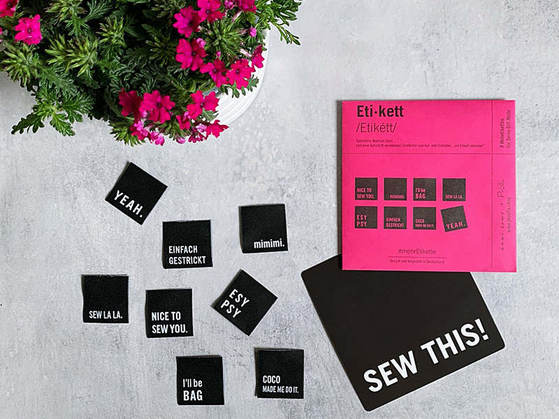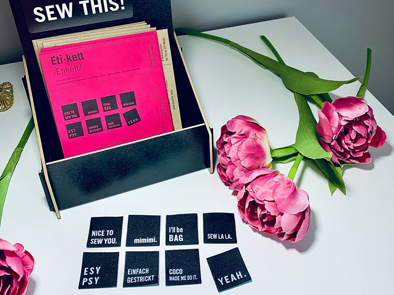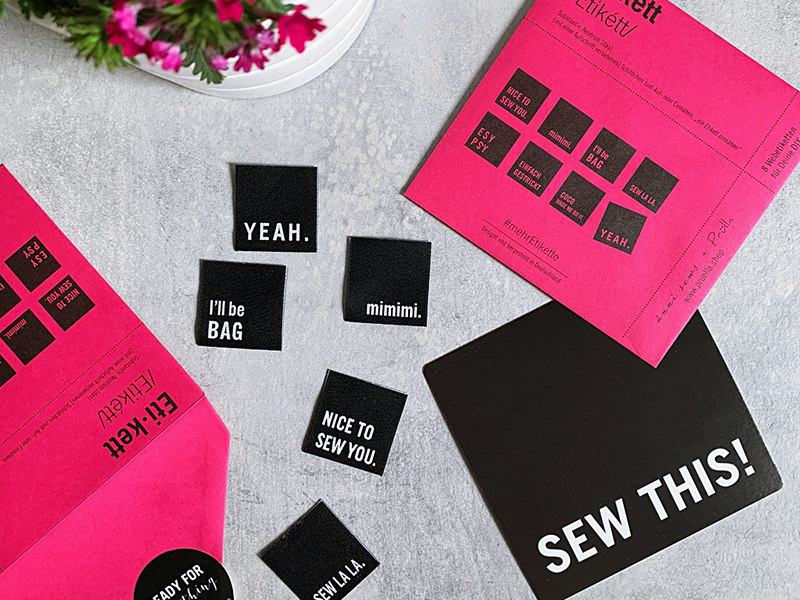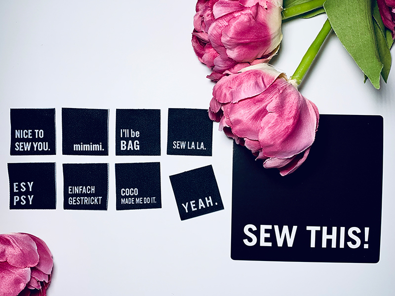 Die Etiketten sind mit einem zur Nähszene passenden (lustigen) Wort oder Spruch versehen. Alle Etiketten sind schwarz mit beidseitig eingewebter weißer Schrift. Sie sind 3 x 3 cm groß, mit Mittelfalz – perfekt zum Ein- und Aufnähen.