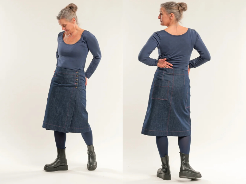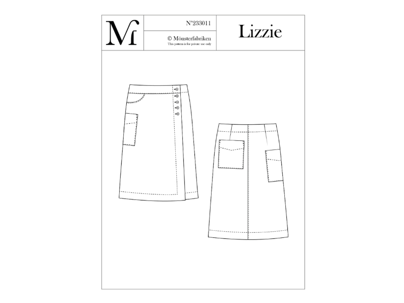 Lizzie ist ein Wickelrock mit einer Reihe raffinierter Details. Er wird seitlich geschlossen mit einer großzügigen Überlappung, so dass die Beine nicht bei jedem Windstoß komplett entblößt werden. Großzügige Taschen sorgen für eine interessante grafische Aufteilung des Rocks, je nach Style können sie aber auch minimiert oder anders aufgeteilt werden. Der Rock kann gefüttert oder ungefüttert genäht werden.
