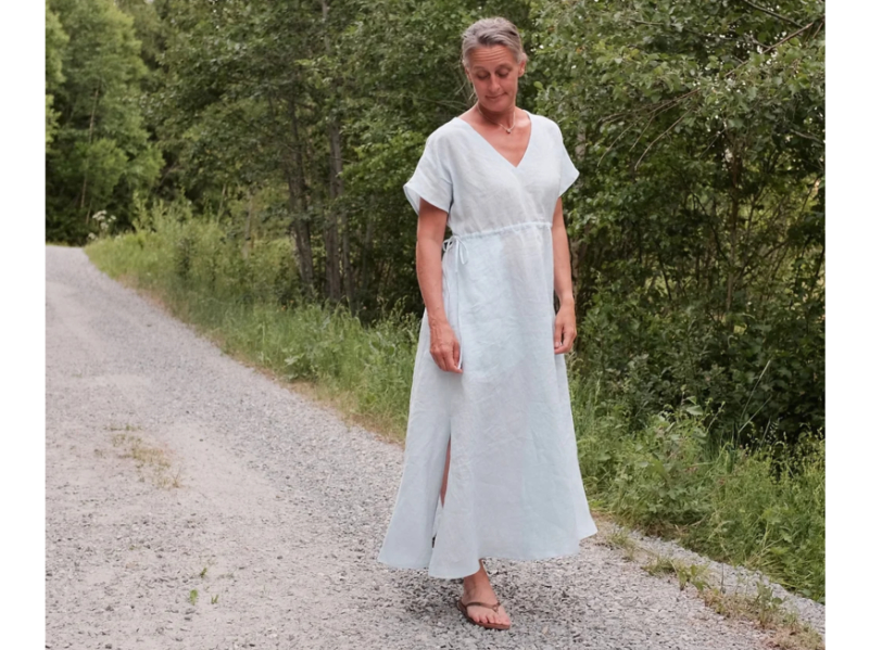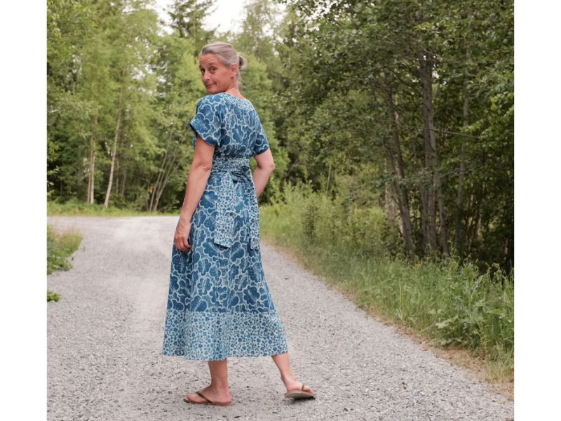 Vanja ist ein sommerliches Kleid – oder Shirt – mit V-Ausschnitt und einer leichten Glockenform im Rockteil. Das Kleid besitzt seitliche Schlitze und seitliche Taschen. Beide Varianten werden leicht gerafft, entweder mit zarten Bindebänerd, einer Gummikordel oder auch festlicher mit einer breiten Schärpe.
