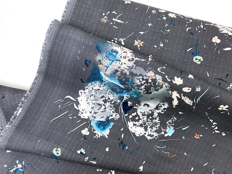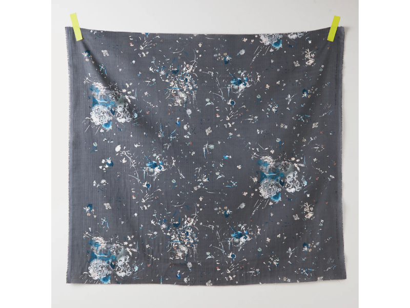 Wunderschönes florales Design in einer gedeckten und trotzdem frischen Farbkombination mit leuchtenden Akzenten in Blau, Türkis und Mint auf grauem Grund. Die farbigen Blüten wirken auf dem Stoff fast wie eine Farbexplosion. Die Blüten sind leicht und wild über die Fläche verteilt. Ein sehr elegantes und sommerliches Muster!