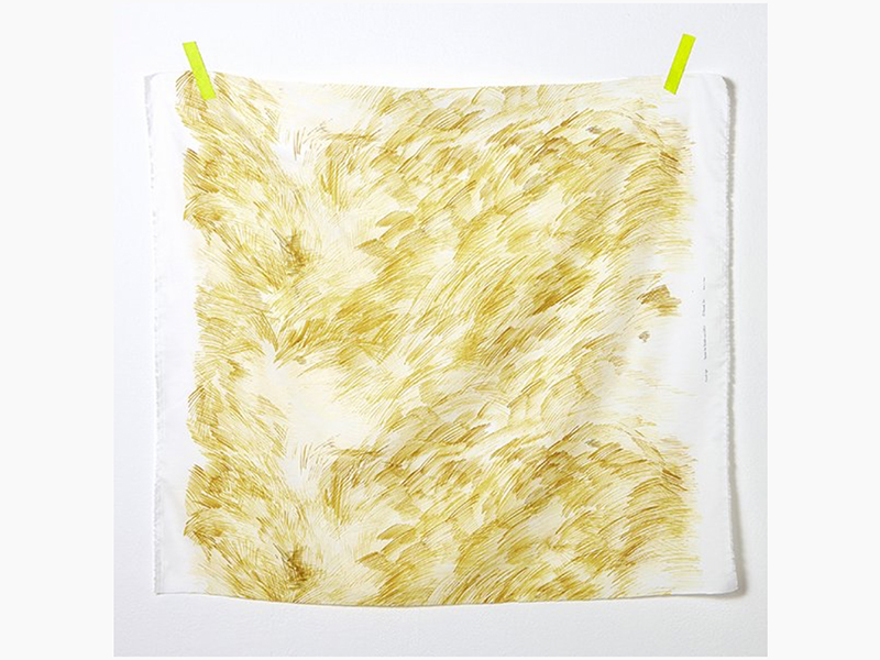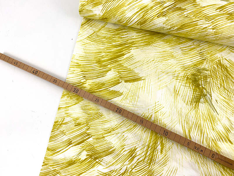 Extrem schönes grafisches Design mit einer lebendigen Landschaft aus Strichen in ockergelb. Dazwischen immer wieder Akzente in Pistazie und superheller Zitrone (leicht metallisch).