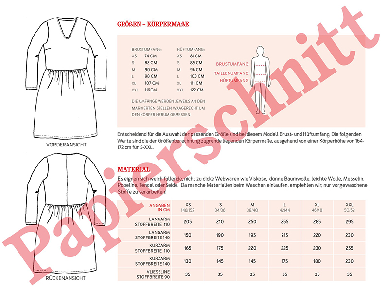 - Materialempfehlung: weich fallende, nicht zu dicke Webwaren wie Viskose, Tencel, dünne Baumwolle, leichte Wolle, Musselin, Popeline oder Seide