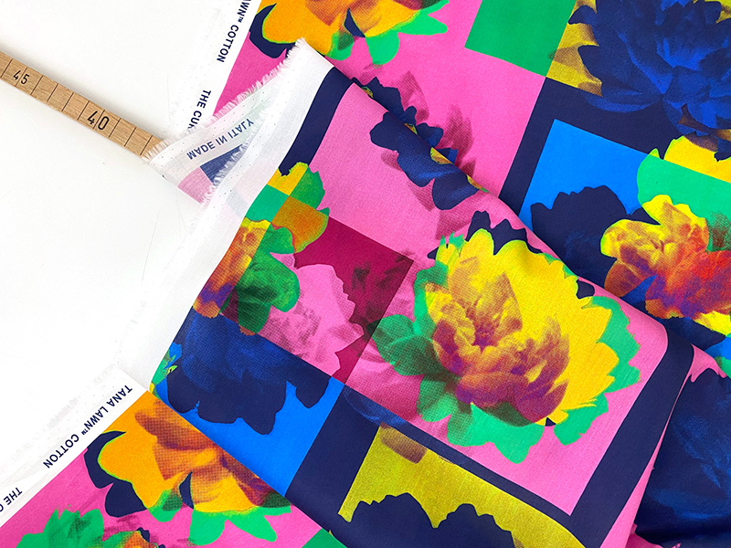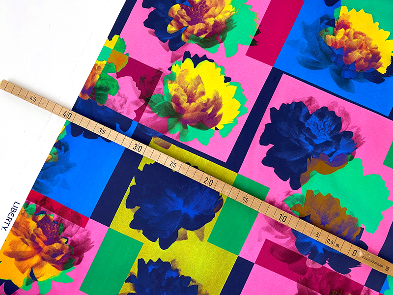 Zarter Baumwollbatist in einzigartiger Qualität mit einem markanten Muster großer Pfingstrosen in leuchtenden Farben und Siebdruckgrafik. Fast ein bisschen Andy Warhol Style. Ein auffälliges und gleichzeitig großartiges Design!