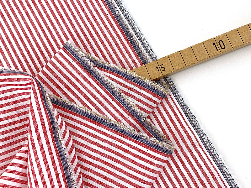 Ein wunderschöner Klassiker! Schmale Streifen in (Denim-) Rot und Weiß, durchgewebt und damit beidseitig identisch. Es handelt sich um eine Yarn Dyed Ware, d. h. das Garn wurde vor der Webung gefärbt.